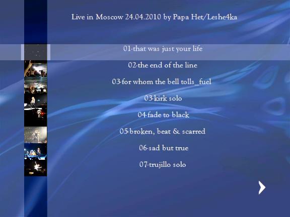 1. The Ecstasy of Gold 2. That Was Just Your Life 3. The End of the Line 4. For Whom the Bell Tolls 5. Fuel 6. Guitar Solo 7. Fade to Black 8. Broken, Beat & Scarred 9. Sad But True 10. Wherever I May Roam 11. Bass Solo 12. Welcome Home (Sanitarium) 13. All Nightmare Long 14. One 15. Master of Puppets (cut) 16. Guitar Solo 17. Nothing Else Matters 18. Enter Sandman 19. Die, Die My Darling 20. Seek and Destroy