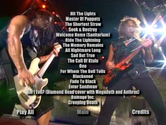 1. The Ectsasy of Gold 2. Hit the Lights 3. Master of Puppets 4. The Shortest Straw 5. Seek and Destroy 6. Welcome Home (Sanitarium) 7. Ride the Lightning 8. The Memory Remains 9. All Nightmare Long 10. Sad but True 11. The Call of Ktulu 12. One 13. For Whom the Bell Tolls 14. Blackened 15. Fade to Black 16. Enter Sandman 17. Am I Evil ? (with Megadeth & Anthrax) 18. Damage, Inc. 19. Creeping Death
