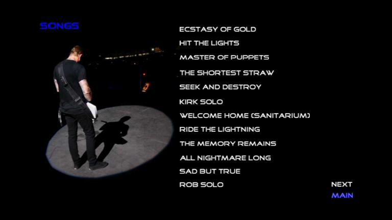 1. Intro / Ecstasy of Gold 2. Hit the Light 3. Master of Puppets 4. The Shortest Straw 5. Seek and Destroy 6. Welcome Home (Sanitarium) 7. Ride the Lightning 8. The Memory Remains 9. All Nightmare Long 10. Sad but True 11. The Call of Ktulu 12. One 13. For Whom the Bell Tolls 14. Blackened 15. Fade to Black 16. Enter Sandman 17. Helpless 18. Damage, Inc. 19. Creeping Death