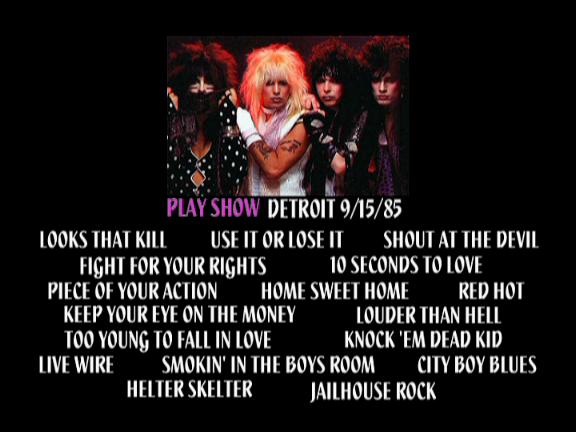 1. Looks That Kill 2. Use It or Lose It 3. Shout at the Devil 4. Fight for Your Rights 5. 10 Seconds to Love 6. Piece of Your Action 7. Home Sweet Home 8. Red Hot 9. Mick's Solo 10. Keep Your Eye on the Money 11. Louder Than Hell 12. Tommy's Solo 13. Too Young to Fall in Love 14. Knock'Em Dead 15. Live Wire 16. Smoking in the Boys Room 17. City Boy Blues 18. Helter Skelter 19. Jailhouse Rock