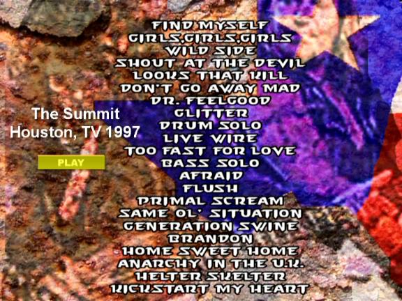 1. Find Myself 2. Girls, Girls, Girls 3. Wild Side 4. Shout at the Devil 5. Looks That Kill 6. Don't Go Away Mad (Just Go Away) 7. Dr.Feelgood 8. Glitter 9. Drum Solo 10. Live Wire 11. Too Fast for Love 12. Bass Solo 13. Afraid 14. Flush 15. Primal Scream 16. S.O.S. 17. Generation Swine 18. Brandon 19. Home Sweet Home 20. Anarchy in the U.K. 21. Helter Skelter 22. Kickstart My Heart