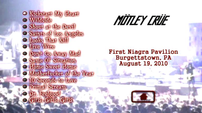 1. Kickstart My Heart 2. Wild Side 3. Shout at the Devil 4. Saints of Los Angeles 5. Looks That Kill 6. Live Wire 7. Don't Go Away Mad (Just Go Away) 8. Same Ol' Situation 9. Home Sweet Home 10. Mutherfucker of the Year 11. 10 Seconds to Love 12. Primal Scream 13. Dr. Feelgood 14. Girls Girls Girls