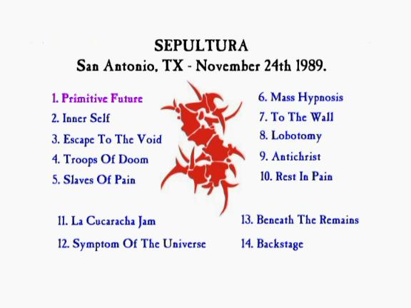 1. Primitive Future 2. Inner Self 3. Escape to the Void 4. Troops of Doom 5. Slaves of Pain 6. Mass Hypnosis 7. To the Wall 8. Lobotomy 9. Antichrist 10. Rest in Pain 11. La Cucaracha Jam 12. Symptom of the Universe 13. Beneath the Remains 14. Backstage Stuff