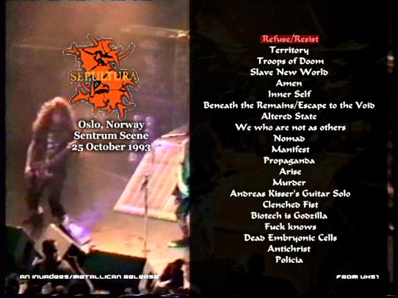 1. Refuse / Resist 2. Territory 3. Troops of Doom 4. Slave New World 5. Amen 6. Inner Self 7. Beneath the Remains / Escape to the Void 8. Altered State 9. We Who Are Not As Others 10. Nomad 11. Manifest 12. Propaganda 13. Arise 14. Murder 15. Andreas Kisser`s Guitar Solo 16. CLenched Fist 17. Biotech Is Godzilla 18. Fuck Knows 19. Dead Embryonic Cells 20. Antichrist 21. Policia