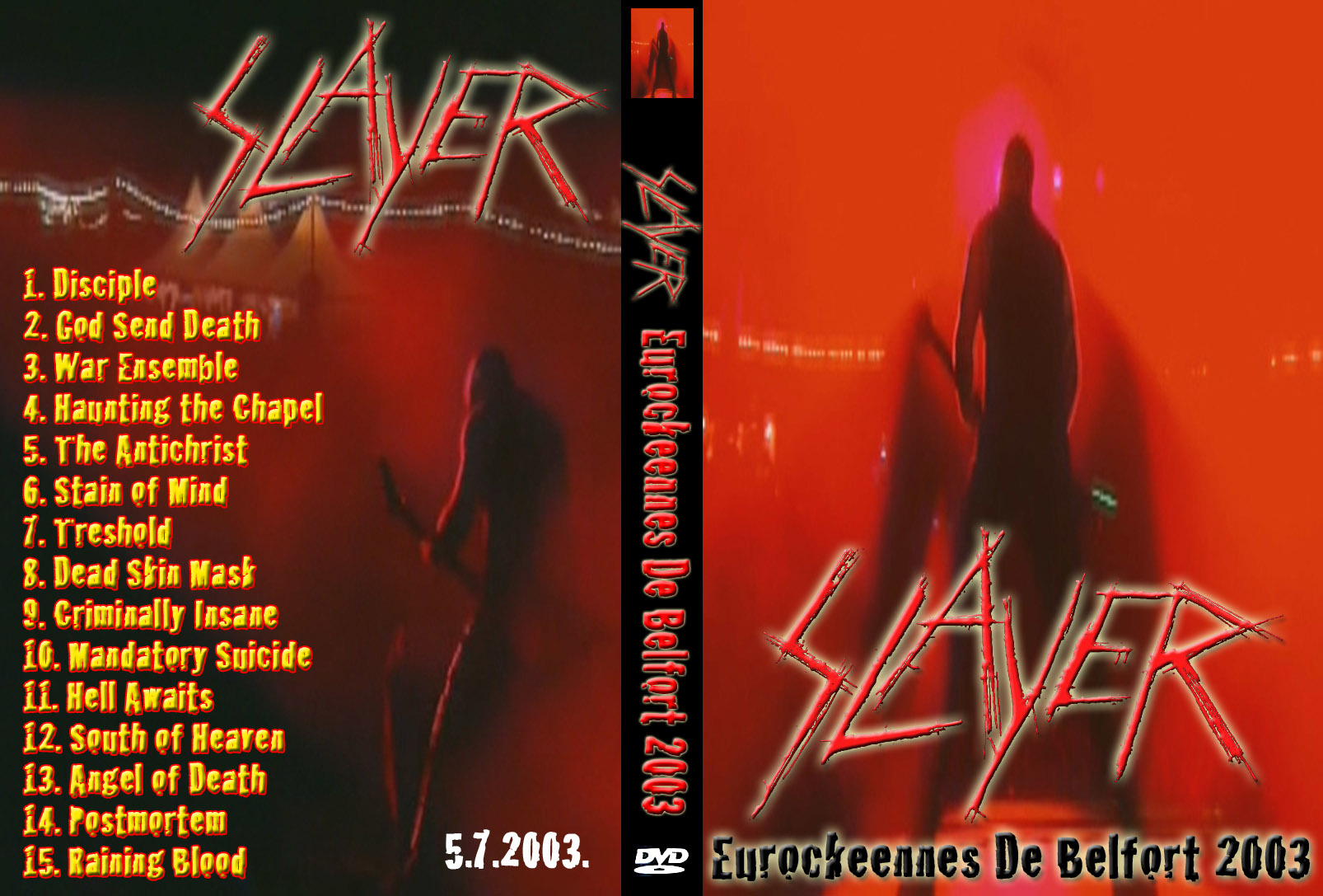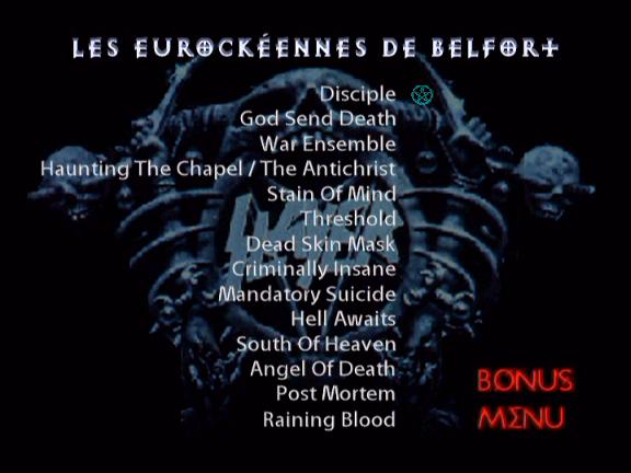 1. Disciple 2. God Send Death 3. War Ensemble 4. Haunting the Chapel / Antichrist 5. Stain of Mind 6. Threshold 7. Dead Skin Mask 8. Criminally Insane 9. Mandatory Suicide 10. Hell Awaits 11. South Of Heaven 12. Angel of Death 13. Post Mortem 14. Raining Blood