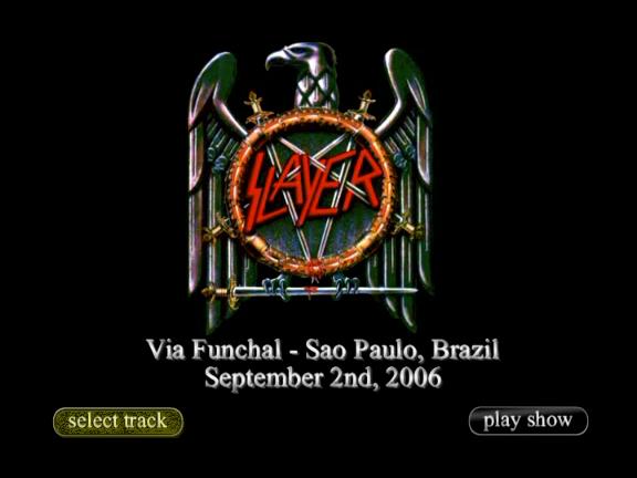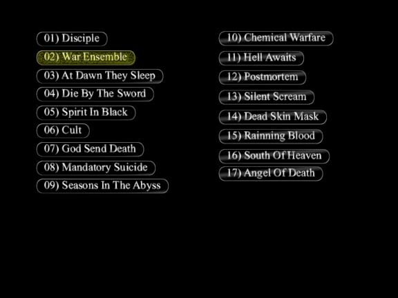 1. Disciple 2. War Ensemble 3. At Dawn They Sleep 4. Die By the Sword 5. Spirit in Black 6. Cult 7. God Send Death 8. Mandatory Suicide 9. Seasons in the Abyss 10. Chemical Warfare 11. Hell Awaits 12. Postmortem 13. Silent Scream 14. Dead Skin Mask 15. Raining Blood 16. South of Heaven 17. Angel of Death