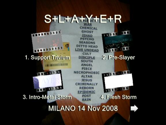 1. Trivium 2. Pre-Slayer 3. Intro Metal Storm 4. Flesh Storm 5. War Ensemble 6. Chemical Warfare 7. Ghosts of War 8. Jihad 9. Psychopathy Red 10. Seasons in the Abyss 11. Dittohead 12. Live Undead 13. Cult 14. Disciple 15. South of Heaven 16. Angel of Death 17. Piece by Piece 18. Necrophobic 19. Altar of Sacrifice 20. Jesus Saves 21. Criminally Insane 22. Reborn 23. Epidemic 24. Postmortem 25. Raining Blood 26. Credits