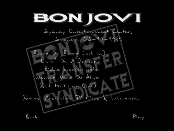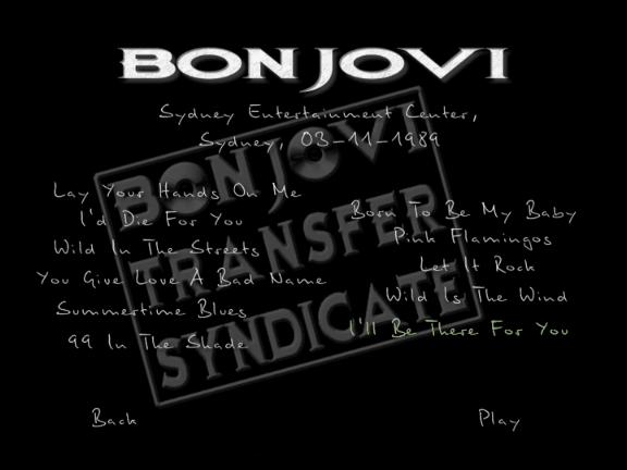 1. Intro 2. Lay Your Hands on Me 3. I'd Die for You 4. Wild in the Streets 5. You Give Love a Bad Name 6. Summertime Blues 7. 99 in the Shade 8. Born to Be My Baby 9. Pink Flamingos 10. Let It Rock 11. Wild Is the Wind 12. I'll Be There for You