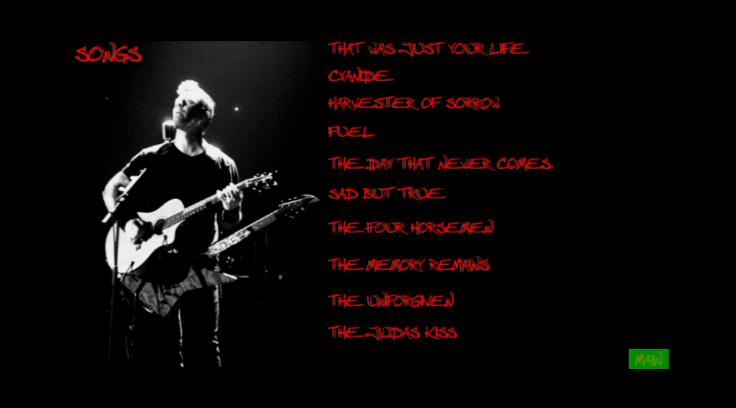 1. The Ecstasy of Gold 2. That Was Just Your Life 3. Cyanide 4. Harvester of Sorrow 5. Fuel 6. The Day That Never Comes 7. Sad but True 8. The Four Horsemen View 9. The Memory Remains 10. The Unforgiven 11.The Judas Kiss