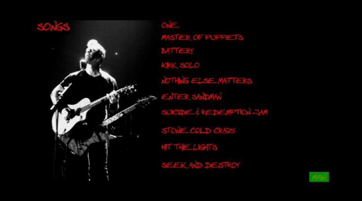 1. One 2. Master of Puppets 3. Battery 4. Kirk Solo 5. Nothing Else Matters 6. Enter Sandman 7. Suicide & Redemption Jam 8. Stone Cold Crazy 9. Hit the Lights 10. Seek and Destroy