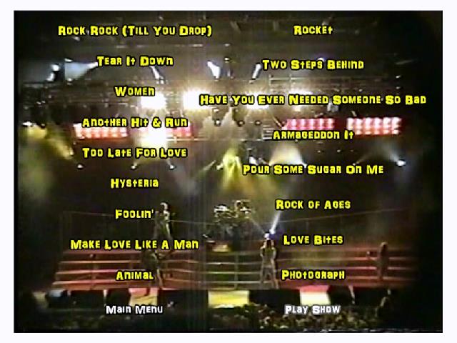 1. Rock! Rock! (Till You Drop) 2. Tear It Down 3. Women 4. Another Hit and Run 5. Too Late for Love 6. Hysteria 7. Foolin' 8. Make Love Like a Man 9. Animal 10. Rocket 11. Two Steps Behind 12. Have You Ever Needed Someone So Bad 13. Armageddon It 14. Pour Some Sugar on Me 15. Rock of Ages 16. Love Bites 17. Photograph