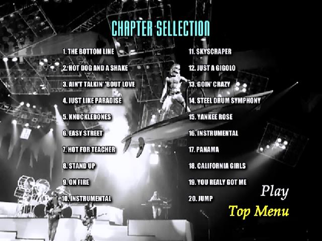1. The Bottom Line 2. Hot Dog and a Shake 3. Ain't Talkin' 'bout Love 4. Just Like Paradise 5. Knucklebones 6. Easy Street 7. Hot for Teacher 8. Stand Up 9. On Fire 10. Instrumental 11. Skyscraper 12. Just a Gigolo / I Ain't Got Nobody 13. Goin' Crazy! 14. Steel Drum Solo 15. Yankee Rose 16. Instrumental 17. Panama 18. California Girls 19. You Really Got Me 20. Jump