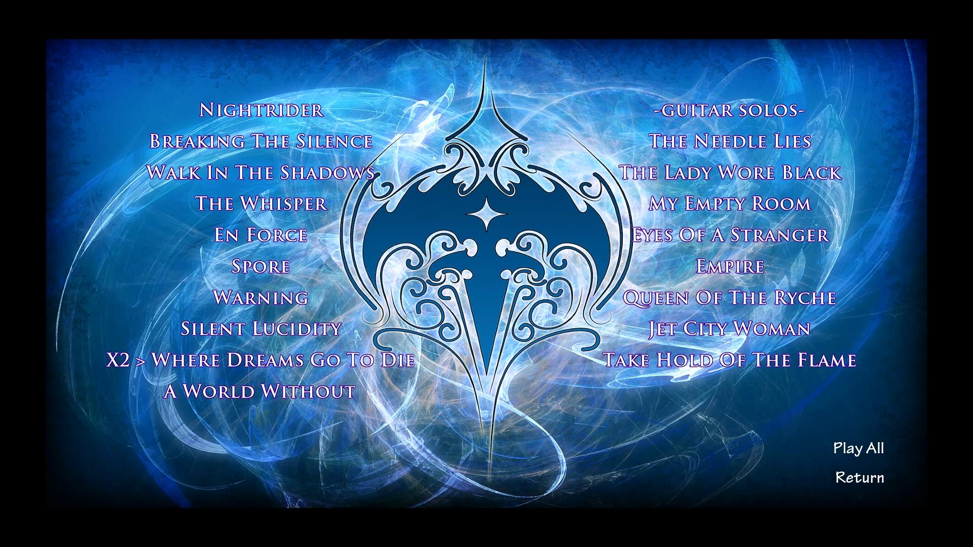 1. Nightrider 2. Breaking the Silence 3. Walk in the Shadows 4. The Whisper 5. En Force 6. Spore 7. Warning 8. Silent Lucidity 9. X2 / Where Dreams Go to Die 10. A World Without 11. Guitar Solo 12. The Needle Lies 13. The Lady Wore Black 14. My Empty Room 15. Eyes of a Stranger 16. Empire 17. Queen of the Reich 18. Jet City Woman 19. Take Hold of the Flame