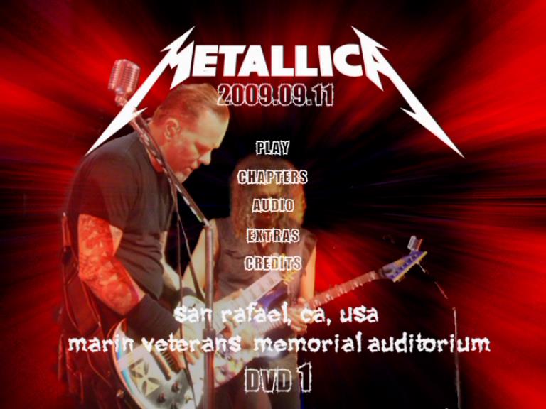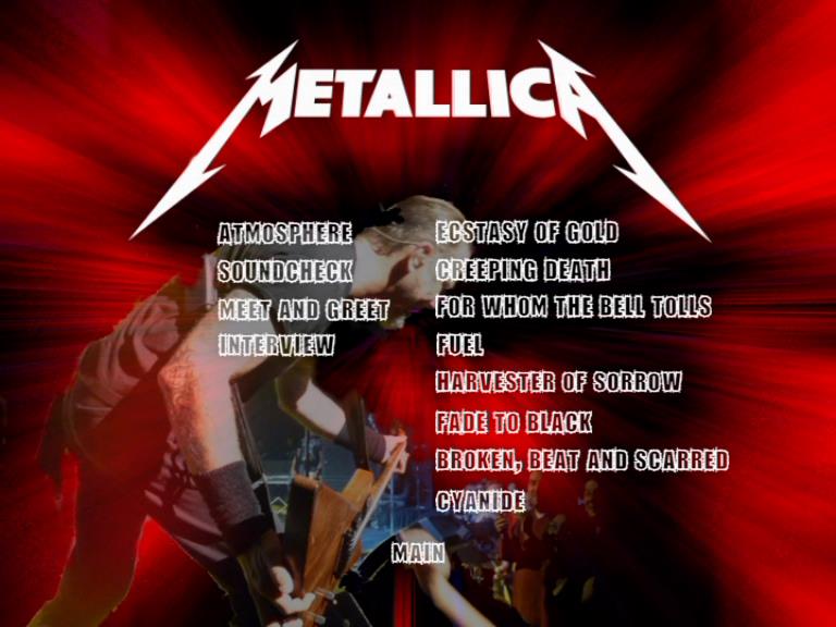 1. Atmosphere 2. Soundcheck 3. Meet n' Greet 4. Interview with James and Rob[screen shot] 5. Ecstasy Of Gold 6. Creeping Death 7. For Whom The Bell Tolls 8. Fuel 9. Harvester Of Sorrow 10. Fade To Black 11. Broken, Beat And Scarred 12. Cyanide