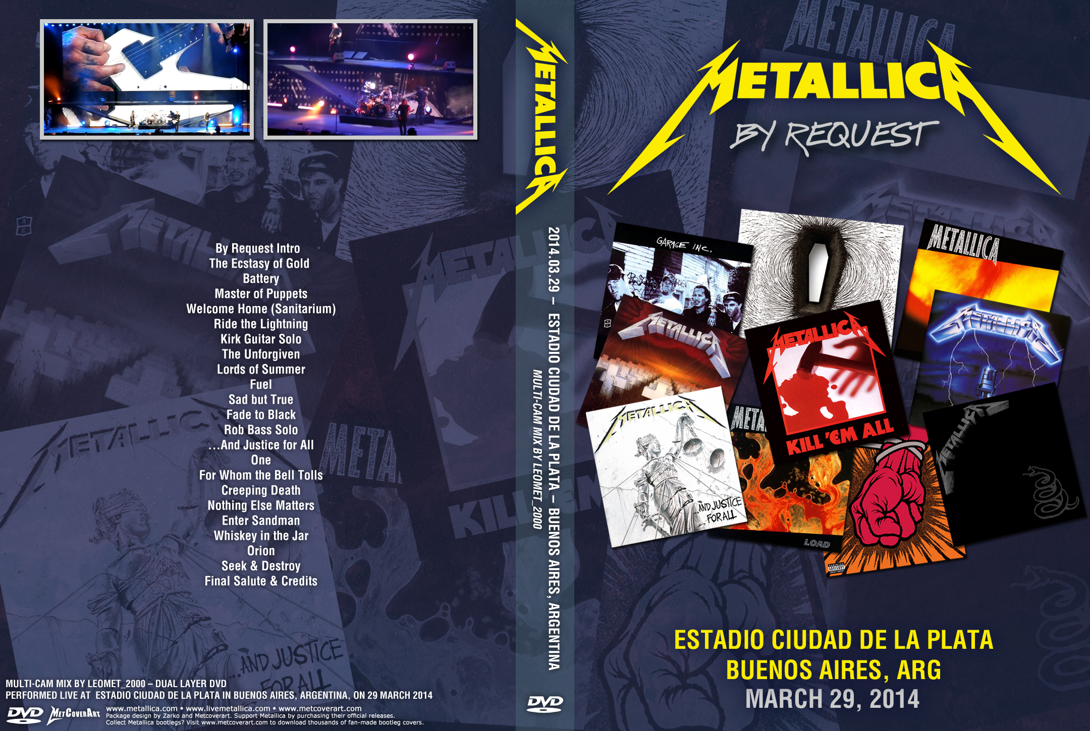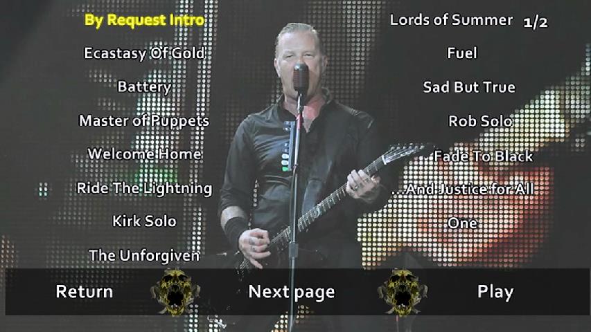 1. Intro by Request 2. The Ecstasy of Gold 3. Battery 4. Master of Puppets 5. Welcome Home (Sanitarium) 6. Ride the Lightning 7. Kirk Guitar Solo 8. The Unforgiven 9. Lords of Summer 10. Fuel 11. Sad but True 12. Fade to Black 13. Rob bass solo 14. ... And Justice for All 15. One 16. For Whom the Bell Tolls 17. Creeping Death 18. Nothing Else Matters 19. Enter Sandman 20. Whiskey in the Jar 21. Orion 22. Seek & Destroy 23. Final Salute & Credits