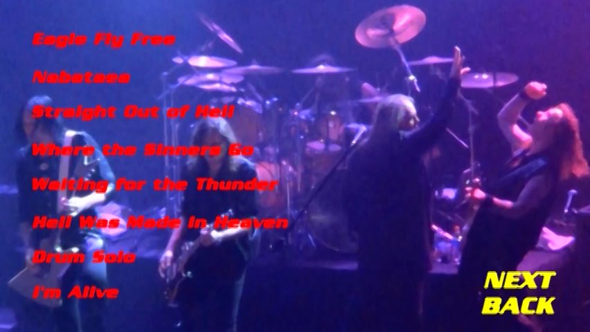 1. Eagle Fly Free 2. Nabataea 3. Straight Out of Hell 4. Where the Sinners Go 5. Waiting for the Thunder 6. Hell Was Made in Heaven 7. Drum Solo 8. I'm Alive 9. Where the Rain Grows 10. Live Now 11. If I Could Fly 12. Power 13. Are You Metal? 14. Dr. Stein 15. Halloween / How Many Tears / Heavy Metal (Is the Law) 16. I Want Out