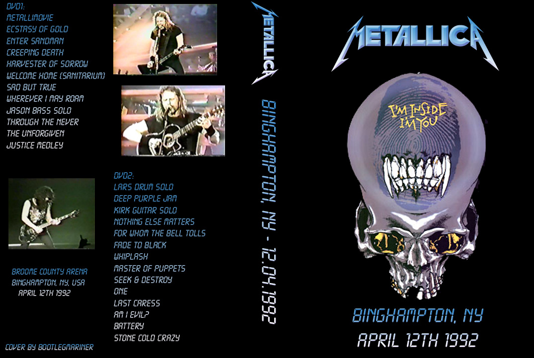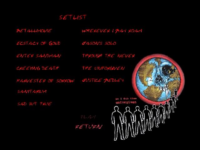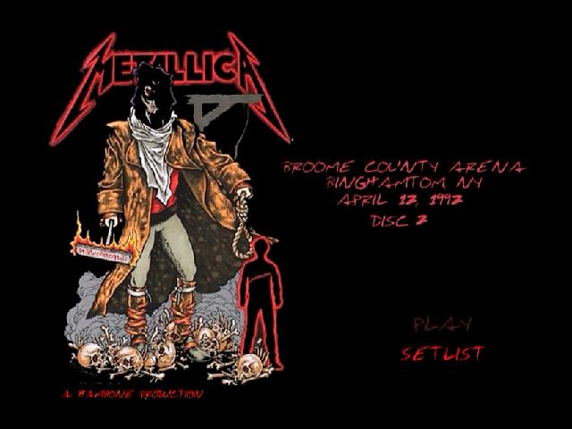 1. Drum Solo 2. Guitar Solo 3. Nothing Else Matters 4. For Whom the Bell Tolls 5. Fade to Black 6. Whiplash 7. Master of Puppets 8. Seek & Destroy 9. One 10. Last Caress 11. Am I Evil? 12. Jam 13. Battery 14. Stone Cold Crazy