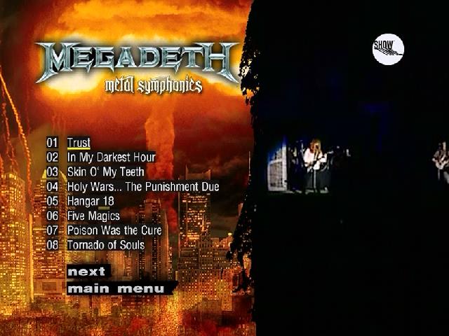 1. Trust 2. In My Darkest Hour 3. Skin O' My Teeth 4. Holy Wars ... The Punishment Due 5. Hangar 18 6. Five Magics 7. Poison Was the Cure 8. Tornado of Souls 9. Rust in Peace ... Polaris 10. Headcrusher 11. Sweating Bullets 12. A Tout le Monde 13. Symphony of Destruction 14. She-Wolf 15. Peace Sells / Holy Wars (reprise)
