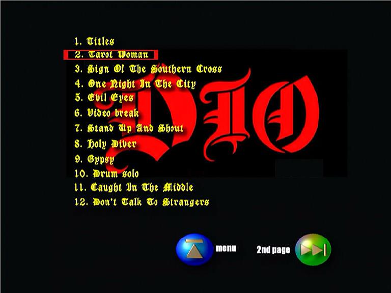 1. Titles 2. Tarot Woman 3. The Sign of the Southern Cross 4. One Night in the City 5. Evil Eyes 6. Video Break 7. Stand Up and Shout 8. Holy Diver 9. Gypsy 10. Drum Solo 11. Caught in the Middle 12. Don't Talk to Strangers