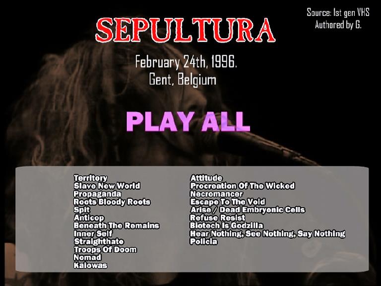 1. Territory 2. Slave New World 3. Propaganda 4. Roots Bloody Roots 5. Spit 6. Anticop 7. Beneath the Remains 8. Inner Self 9. Straighthate 10. Troops of Doom 11. Nomad 12. Kaiowas 13. Attitude 14. Procreation (of the Wicked) 15. Necromancer 16. Escape to the Void 17. Arise / Dead Embryonic Cells 18. Refuse/Resist 19. Biotech Is Godzilla 20. Hear Nothing, See Nothing, Say Nothing 21. Polícia