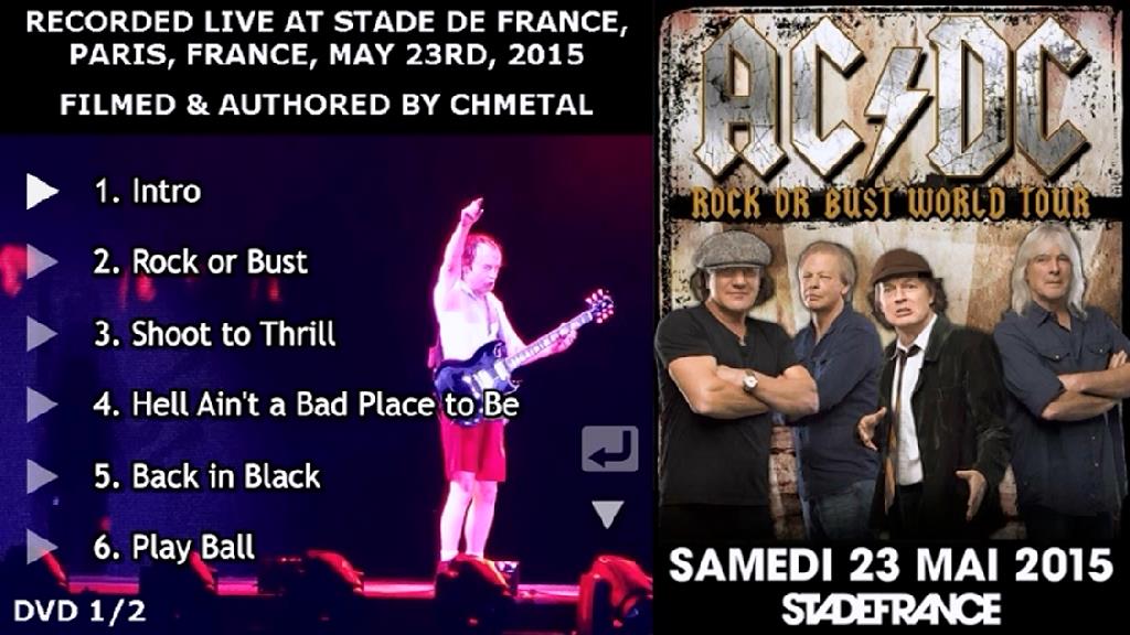 1. Intro * 2. Rock or Bust 3. Shoot to Thrill 4. Hell Ain't a Bad Place to Be 5. Back in Black 6. Play Ball 7. Dirty Deeds Done Dirt Cheap 8. Thunderstruck 9. High Voltage 10. Rock 'n' Roll Train 11. Hells Bells 12. Baptism by Fire 13. You Shook Me All Night Long