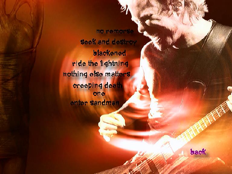 1. No Remorse 2. Seek & Destroy 3. Blackened 4. Ride the Lightning 5. Nothing Else Matters 6. Creeping Death 7. One 8. Enter Sandman