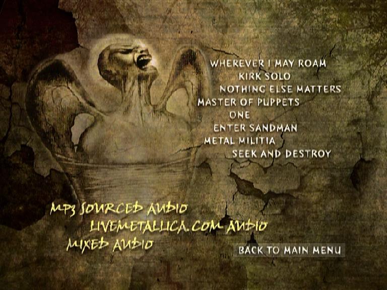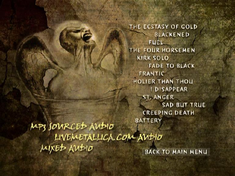 1. The Ecstacy of Gold 2. Blackened 3. Fuel 4. The Four Horsemen 5. Kirk's First Guitar Solo 6. Fade to Black 7. Frantic 8. Holier Than Thou 9. I Disappear 10. St. Anger 11. Sad but True 12. Creeping Death 13. Battery