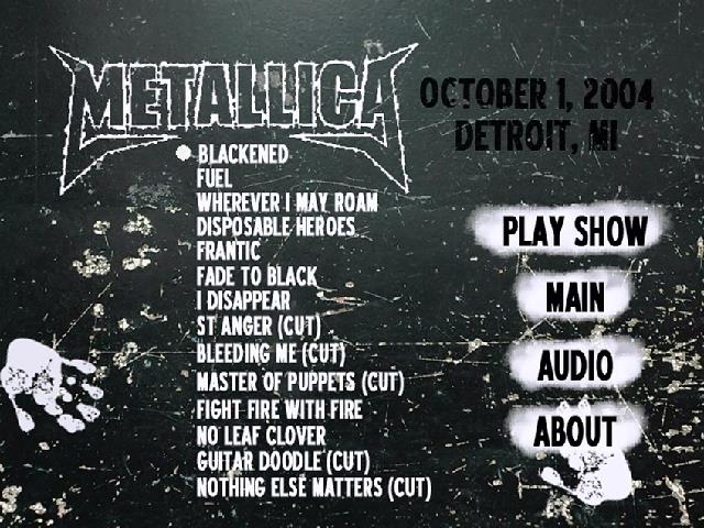 1. Blackened (Cut) 2. Fuel 3. Wherever I May Roam 4. Disposable Heroes 5. Frantic 6. Fade to Black 7. I Disappear 8. St. Anger (Cut) 9. Bleeding Me (Cut) 10. Master of Puppets (Cut) 11. Fight Fire with Fire 12. No Leaf Clover 13. Nothing Else Matters (Cut)