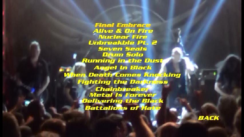 1. Final Embrace 2. Alive & On Fire 3. Nuclear Fire 4. Unbreakable Pt. 2 5. Seven Seals 6. Drum Solo 7. Running in the Dust 8. Angel In Black 9. When Death Comes Knocking 10. Fighting the Darkness 11. Chainbreaker 12. Metal Is Forever 13. Delivering the Black 14. Battalions of Hate