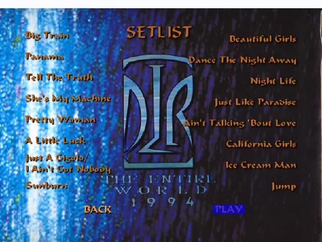 1. Big Train 2. Panama 3. Tell the Truth 4. She's My Machine 5. Oh, Pretty Woman 6. A Little Luck 7. Just a Gigolo / I Ain't Got Nobody 8. Sunburn 9. Beautiful Girls 10. Dance the Night Away 11. Night Life 12. Just Like Paradise 13. Ain't Talkin' 'Bout Love 14. California Girls 15. Ice Cream Man 16. Jump