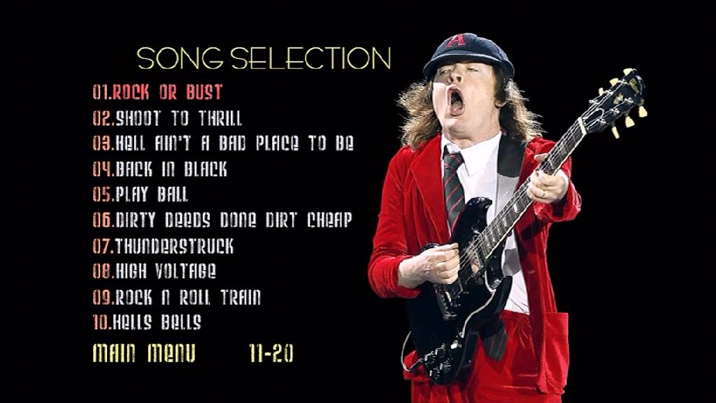 1. Rock or Bust 2. Shoot to Thrill 3. Hell Ain't a Bad Place to Be 4. Back in Black 5. Play Ball 6. Dirty Deeds Done Dirt Cheap 7. Thunderstruck 8. High Voltage 9. Rock 'n' Roll Train 10. Hells Bells 11. Baptism by Fire 12. You Shook Me All Night Long 13. Sin City 14. Shot Down In Flames 15. Have a Drink on Me 16. T.N.T. 17. Whole Lotta Rosie 18. Let There Be Rock 19. Highway to Hell 20. For Those About to Rock (We Salute You)