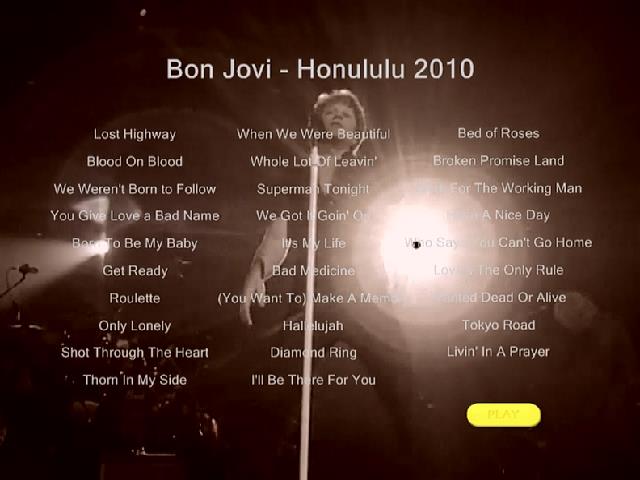 1. Lost Highway (Promo) 2. Blood on Blood 3. We Weren’t Born to Follow 4. You Give Love a Bad Name 5. Born to Be My Baby 6. Get Ready 7. Roulette 8. Only Lonely 9. Shot Through the Heart 10. Thorn in My Side 11. When We Were Beautiful 12. Whole Lotta Leaving’ 13. Superman Tonight 14. We Got It Going on 15. It’s My Life 16. Bad Medicine 17. You Want to Make a Memory 18. Hallelujah 19. Diamond 20. I’ll Be There for You 21. Bed of Roses 22. Broken Promise Land 23. Work for the Working Man 24. Have a Nice Day 25. Who Says You Can’t Go Home? 26. Love's the Only Rule 27. Wanted Dead or Alive 28. Tokyo Road 29. Living on a Prayer