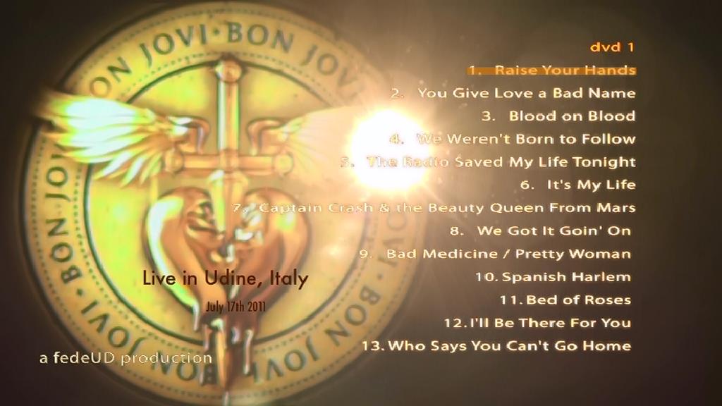 1. Raise Your Hands 2. You Give Love a Bad Name 3. Blood on Blood 4. We Weren't Born to Follow 5. The Radio Saved My Life Tonight 6. It's My Life 7. Captain Crash & The Beauty Queen From Mars 8. We Got It Going on 9. Bad Medicine / Pretty Woman 10. Spanish Harlem 11. Bed of Roses 12. I'll Be There for You 13. Who Says You Can't Go Home