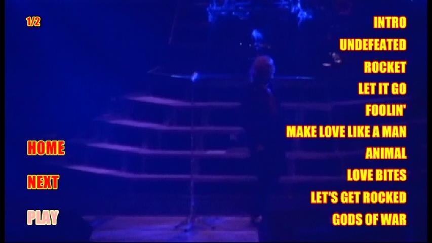 1. Undefeated 2. Rocket 3. Let It Go 4. Foolin' 5. Make Love Like a Man 6. Animal 7. Love Bites 8. Let's Get Rocked 9. Gods of War 10. Where Does Love Go When It Dies / Now / When Love and Hate Collide / Have You Ever Needed Someone So Bad / Two Steps Behind (Acoustic Medley) 11. Women 12. Bringin' on the Heartbreak 13. Switch 625 14. Hysteria 15. Armageddon It 16. Photograph 17. Pour Some Sugar on Me 18. Rock of Ages