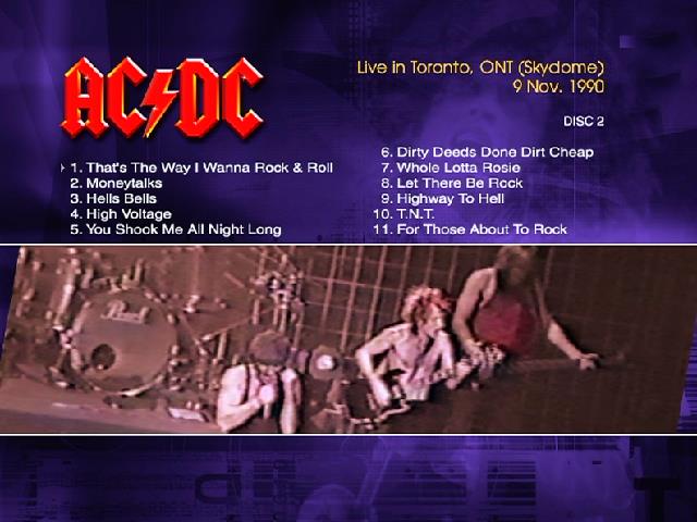 1. That's the Way I Wanna Rock 'n' Roll 2. Moneytalks 3. Hells Bells 4. High Voltage 5. You Shook Me All Night Long 6. Dirty Deeds Done Dirt Cheap 7. Whole Lotta Rosie 8. Highway to Hell 9. Let There Be Rock 10. TNT 11. For Those About to Rock