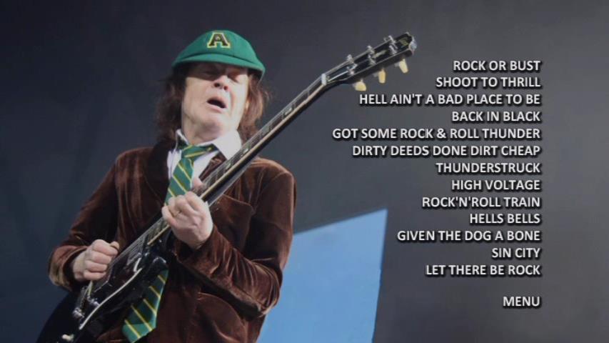 1. Rock or Bust 2. Shoot to Thrill 3. Hell Ain't a Bad Place to Be 4. Back in Black 5. Got Some Rock & Roll Thunder 6. Dirty Deeds Done Dirt Cheap 7. Thunderstruck 8. High Voltage 9. Rock 'N' Roll Train 10. Hells Bells 11. Given the Dog a Bone 12. Sin City 13. Let There Be Rock