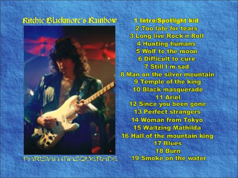 1. Intro / Spotlight Kid 2. Too Late for Tears 3. Long Live Rock 'n' Roll 4. Hunting Humans (Insatiable) 5. Wolf to the Moon 6. Difficult to Cure 7. Still I'm Sad 8. Man on the Silver Mountain 9. The Temple of the King 10. Black Masquerade 11. Ariel 12. Since You Been Gone 13. Perfect Strangers 14. Woman From Tokyo 15. Waltzing Matilda 16. Hall of the Mountain King 17. Blues 18. Burn 19. Smoke on the Water