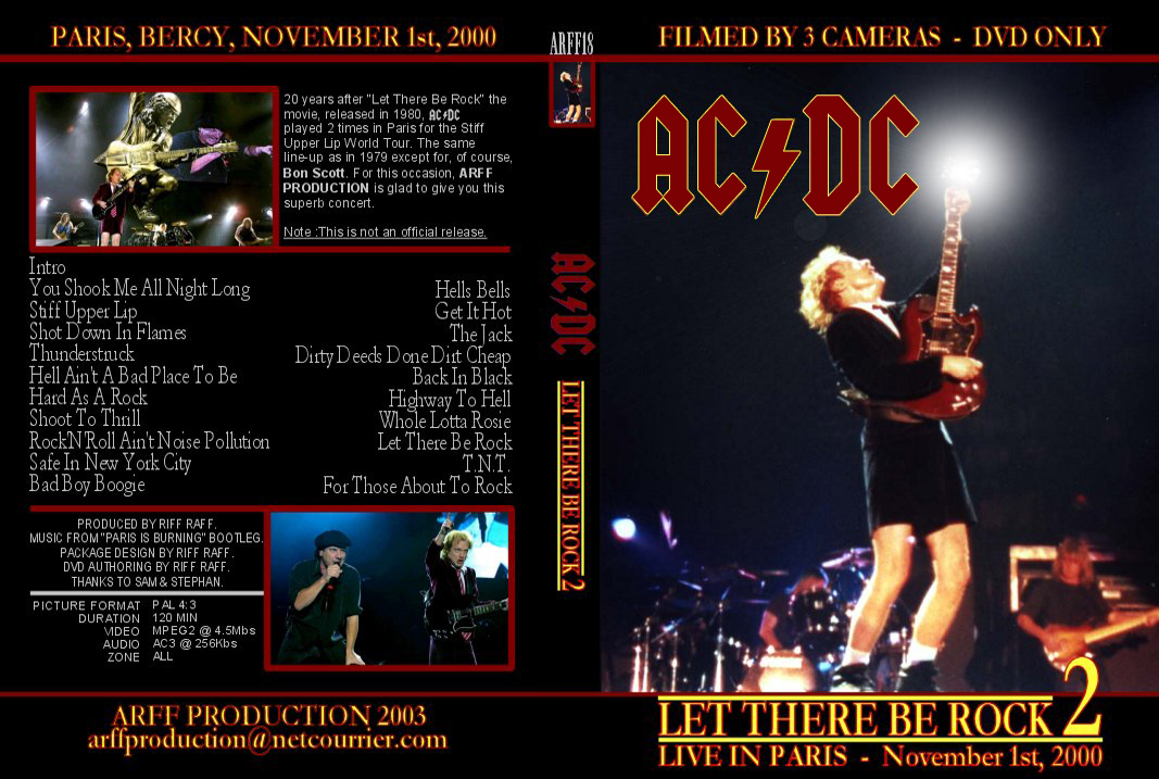 1. Intro 2. You Shook Me All Night Long 3. Stiff Upper Lip 4. Shot Down in Flames 5. Thunderstruck 6. Hell Ain't A Bad Place to Be 7. Hard as a Rock 8. Shoot to Thrill 9. Rock'N'Roll Ain't Noise Pollution 10. Safe in New York City 11. Bad Boy Boogie 12. Hells Bells 13. Get It Hot 14. The Jack 15. Dirty Deeds Done Dirt Cheap 16. Back in Black 17. Highway to Hell 18. Whole Lotta Rosie 19. Let There Be Rock 20. T.N.T. 21. For Those About to Rock