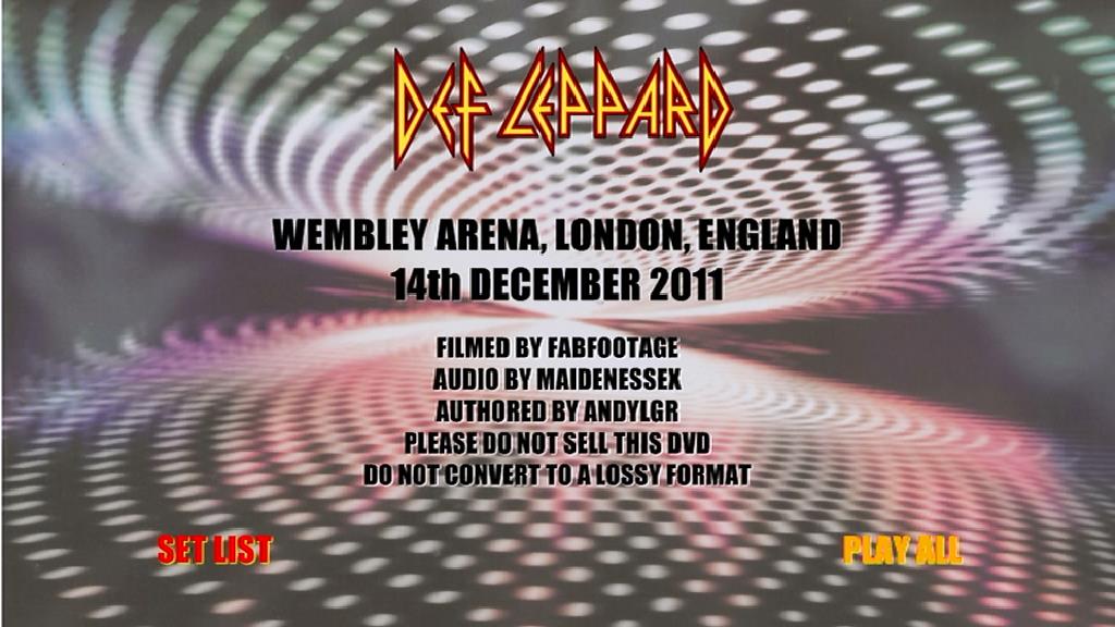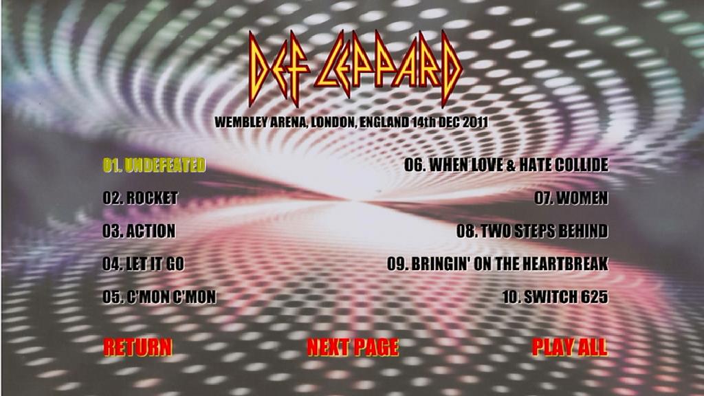 1. Undefeated 2. Rocket 3. Action 4. Let It Go 5. C'mon C'mon 6. When Love and Hate Collide 7. Women 8. Two Steps Behind (Acoustic) 9. Bringin' on the Heartbreak (Acoustic Intro) 10. Switch 625 11. Hysteria 12. Animal 13. Armageddon It 14. Photograph 15. Pour Some Sugar on Me 16. Love Bites 17. Let's Get Rocked