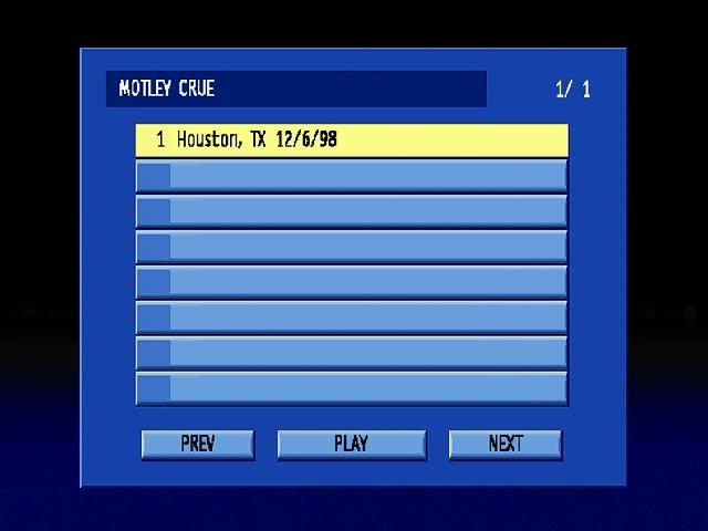 1. Intro 2. Dr. Feelgood 3. Girls, Girls, Girls 4. Enslaved 5. Live Wire 6. Shout at the Devil 7. Wild Side 8. Home Sweet Home 9. Don't Go Away Mad (Just Go Away) 10. Bitter Pill 11. Looks That Kill 12. Primal Scream 13. Same Ol' Situation (S.O.S.) 14. Smokin' in the Boys' Room 15. Guitar Solo 16. Kickstart My Heart 17. Ten Seconds to Love 18. Anarchy in the U.K.