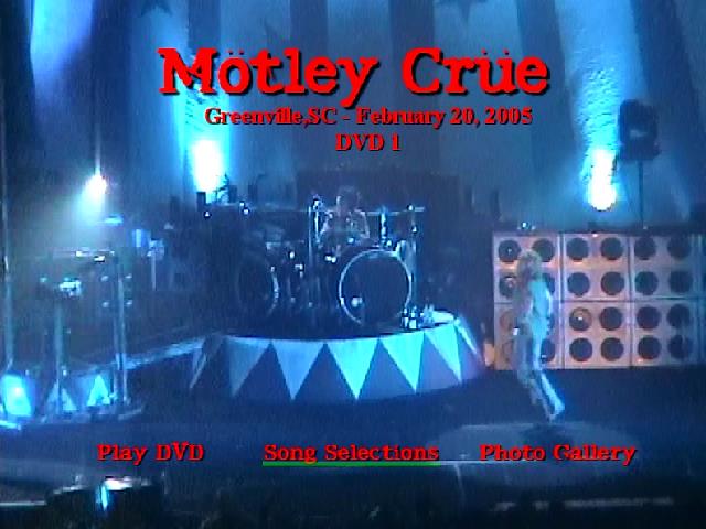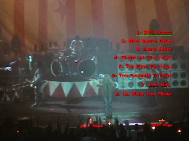 1. Start DVD 1 2. Mini Movie Intro 3. Show Intro 4. Shout at the Devil 5. Too Fast for Love 6. Ten Seconds to Love 7. Red Hot 8. On With the Show 9. Too Young to Fall in Love 10. Looks That Kill 11. Louder Than Hell 12. Live Wire 13. Girls, Girls, Girls 14. Wild Side 15. Don't Go Away Mad (Just Go Away) 16. Primal Scream