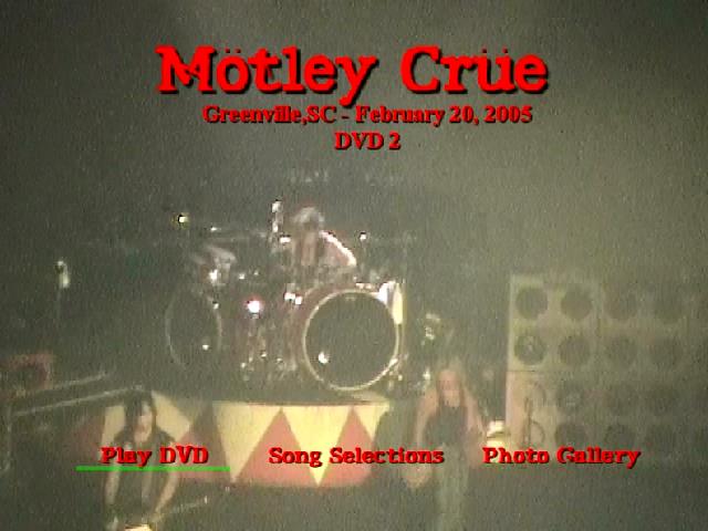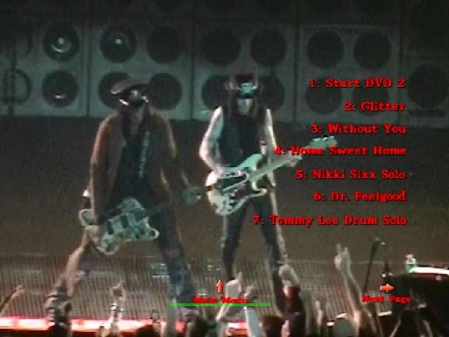 1. Start DVD 2 2. Glitter 3. Without You 4. Home Sweet Home 5. Bass Solo 6. Dr. Feelgood 7. Drum Solo 8. Same Ol' Situation (S.O.S.) 9. If I Die Tomorrow 10. Sick Love Song 11. Kickstart My Heart 12. Helter Skelter 13. Anarchy in the U.K.