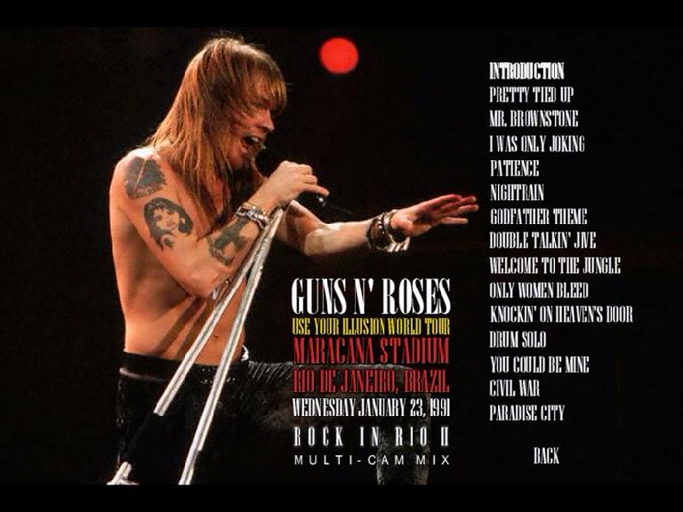 1. Introduction 2. Pretty Tied Up 3. Mr. Brownstone 4. I Was Only Joking 5. Patience 6. Nightrain 7. Godfather Theme 8. Double Talkin' Jive 9. Welcome to the Jungle 10. Only Women Bleed 11. Knockin' on Heaven's Door 12. Drum Solo 13. You Could Be Mine 14. Civil War 15. Paradise City