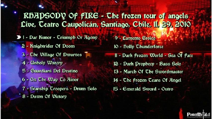 1. Dar Kunor / Triumph or Agony 2. Knightrider of Doom 3. The village of Dwarves 4. Unholly Warcry 5. Guardiani del Destino 6. On the Way to Ainor 7. Starship Troopers / Drum Solo 8. Dawn of Victory 9. Lamento Eroico 10. Holly Thunderforce 11. Dark Frozen World / Sea of Fate 12. Dark Prophecy / Bass Solo 13. March of Swordmaster 14. The Frozen Tears of Angel 15. Emerald Sword / Outro