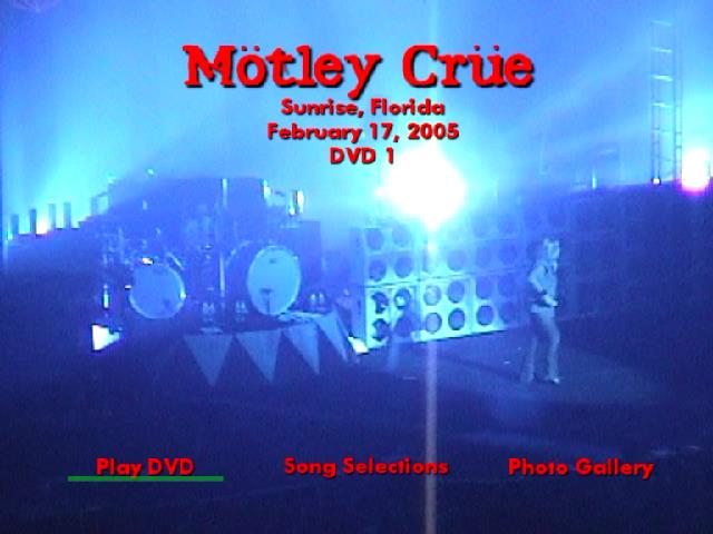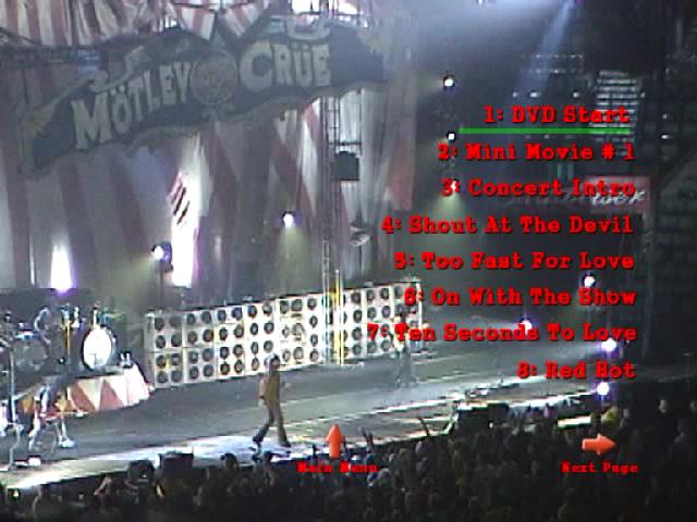 1. DVD Start 2. Mini Movie #1 3. Concert Intro 4. Shout At The Devil 5. Too Fast For Love 6. On With The Show 7. Ten Seconds To Love 8. Red Hot 9. Too Young To Fall In Love 10. Looks That Kill 11. Live Wire 12. Mini Movie #2 13. Girls, Girls, Girls 14. Wild Side 15. Don't Go Away Mad (Just Go Away) 16. Primal Scream