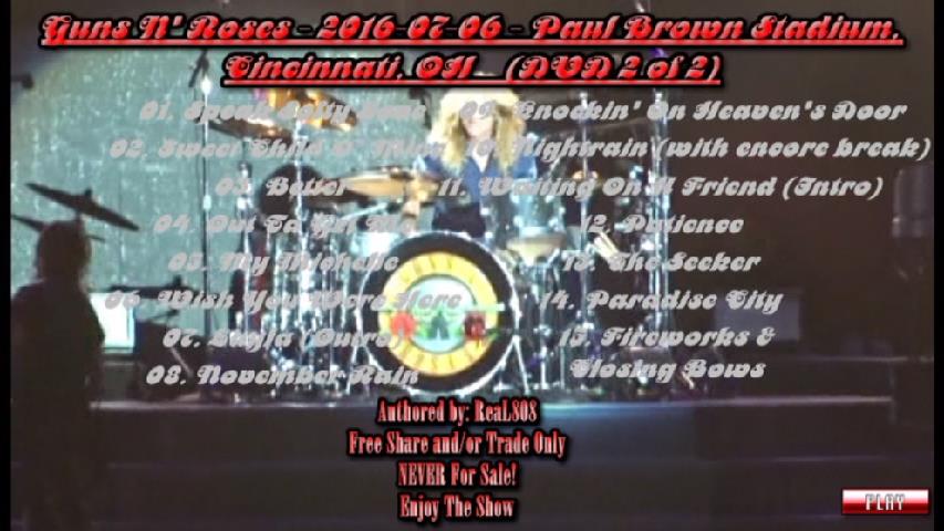 1. Preshow (Looney Tunes + The Equalizer) 2. It's So Easy 3. Mr. Brownstone 4. Chinese Democracy 5. Welcome to the Jungle 6. Double Talkin' Jive 7. Estranged 8. Live and Let Die (Cut) 9. Live and Let Die (Continued) 10. Rocket Queen 11. You Could Be Mine 12. Attitude (with "You Can't Put Your Arms Around A Memory" intro (Duff on vocals) 13. This I Love 14. Civil War (with a short Voodoo Chile riff at the end - Jimi Hendrix) 15. Coma (with Band Introduction)