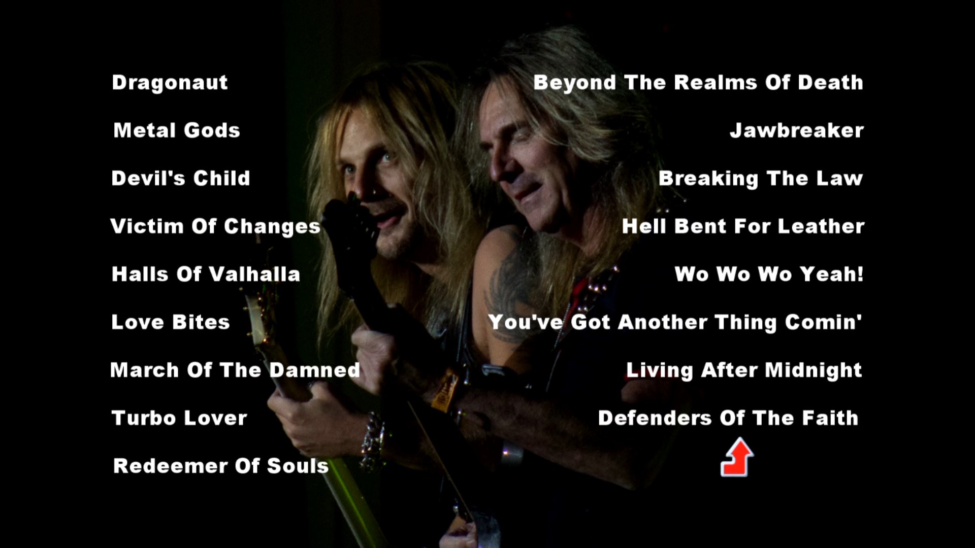 1. Dragonaut 2. Metal Gods 3. Devil's Child 4. Victim of Changes 5. Halls of Valhalla 6. Love Bites 7. March of the Damned 8. Turbo Lover 9. Redeemer of Souls 10. Beyond the Realms of Death 11. Jawbreaker 12. Breaking the Law 13. Hell Bent for Leather 14. Wo Wo Wo Yeah! 15. You've Got Another Thing Comin' 16. Living After Midnight 17. Defenders of the Faith
