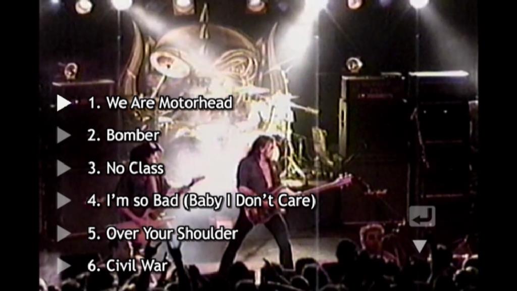 1. We Are Motorhead 2. Bomber 3. No Class 4. I’m so Bad (Baby I Don’t Care) 5. Over Your Shoulder 6. Civil War 7. Metropolis 8. Overnight Sensation 9. God Save the Queen 10. Born to Raise Hell 11. Stay Out of Jail 12. Dead Men Tell No Tales 13. Sacrifice (incl. Drum Solo) 14. Orgasmatron 15. Going to Brazil 16. Iron Fist 17. Killed by Death 18. Ace of Spades 19. Overkill (with James Hetfield)