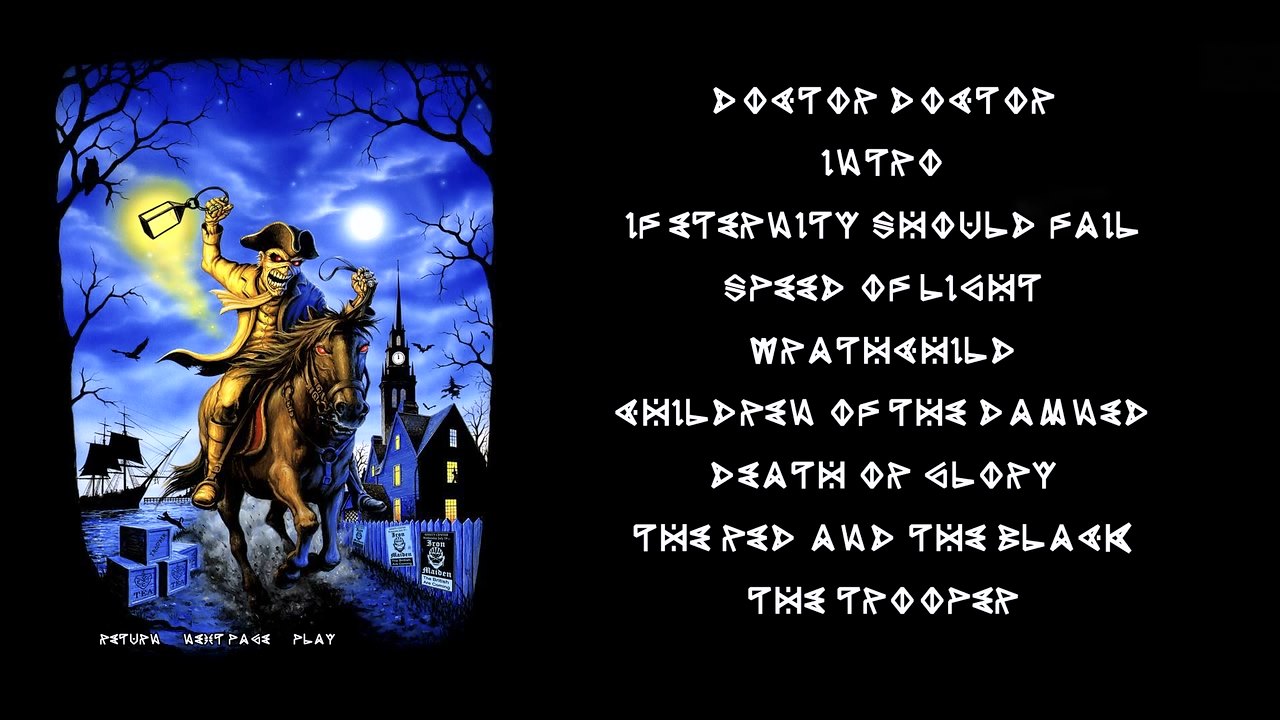 1. Doctor Doctor 2. Intro 3. If Eternity Should Fail 4. Speed of Light 5. Wrathchild 6. Children of the Damned 7. Death or Glory 8. The Red and the Black 9. The Trooper 10. Powerslave 11. The Great Unknown 12. The Book of Souls 13. Fear of the Dark 14. Iron Maiden 15. The Number of the Beast 16. Blood Brothers 17. Wasted Years 18. Outro