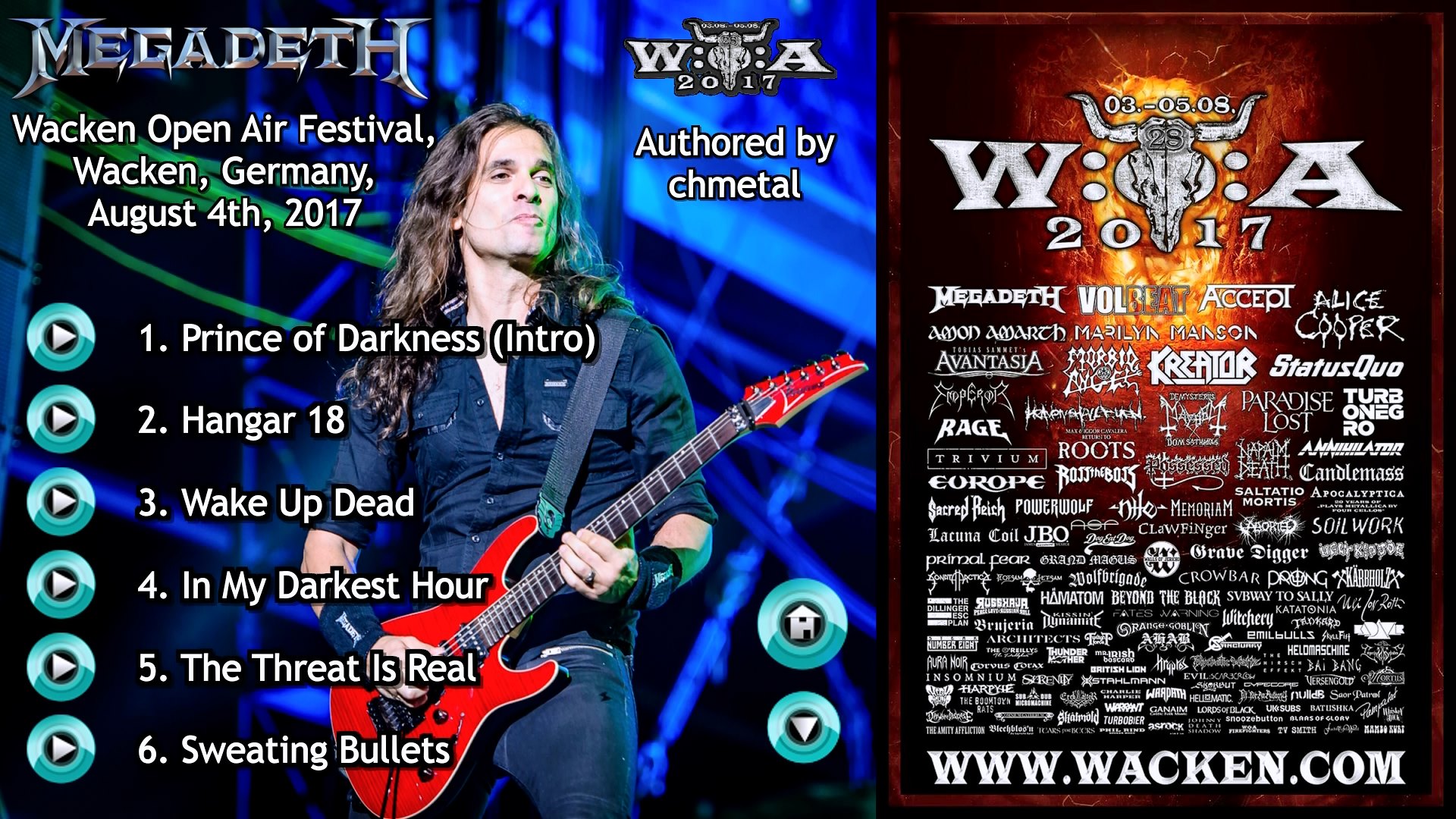 1. Prince of Darkness (Intro) 2. Hangar 18 3. Wake Up Dead 4. In My Darkest Hour 5. The Threat Is Real 6. Sweating Bullets 7. Conquer or Die! 8. Lying in State 9. Poisonous Shadows 10. Trust 11. Fatal Illusion 12. Tornado of Souls 13. Dystopia 14. Symphony of Destruction 15. Mechanix 16. Peace Sells 17. Holy Wars... The Punishment Due 18. Silent Scorn (Outro)